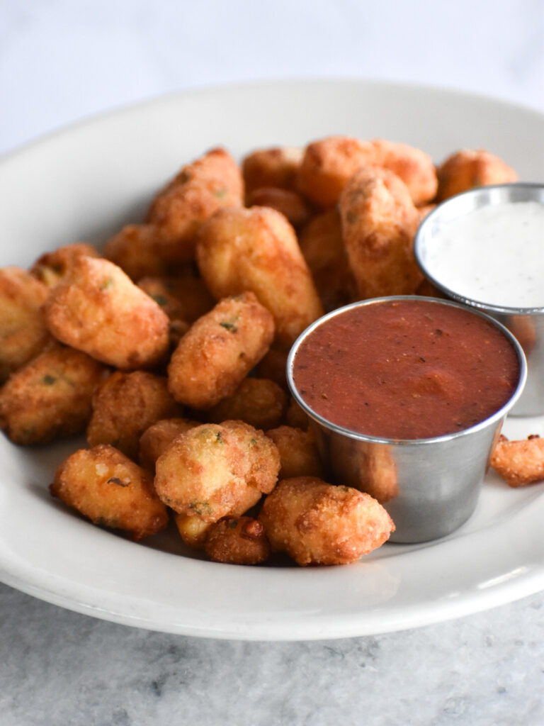 HALF POUND OF DEEP-FRIED WISCONSIN GARLIC CHEESE CURDS WITH HOUSE-MADE MARINARA AND RANCH $13